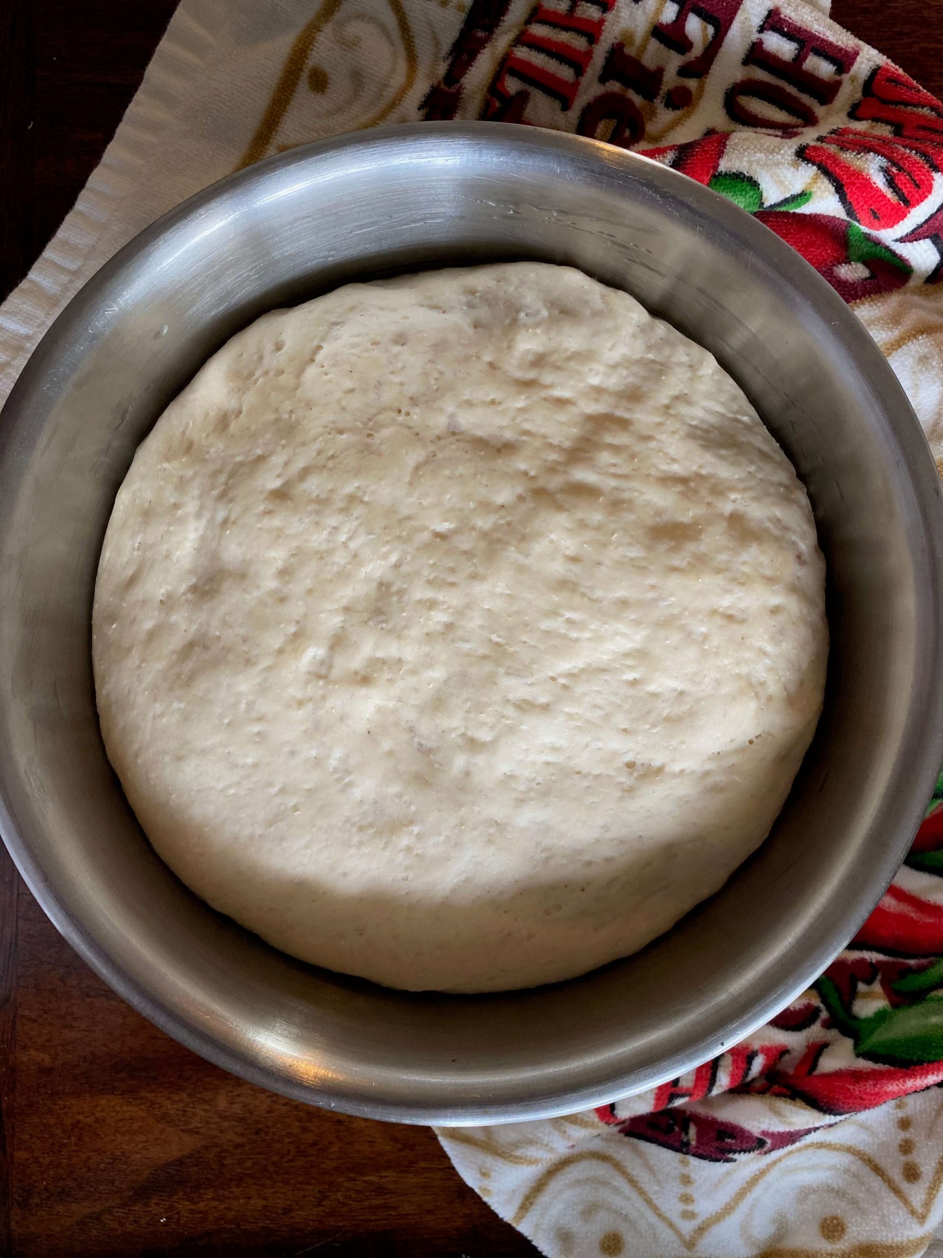 If mixing by hand, add all the ingredients to a bowl and mix, once the dough comes together, knead it for about 5 minutes. Cover it and keep it in a warm place to rise. I made mine in the stand mixer as it is so convenient and was ready in about 10 minutes, I added about 1/4 cup more water than the recipe called for. Once it was done, I removed the dough and placed it in an oiled bowl, covered the bowl with a dishtowel, and kept it in my oven to rise.